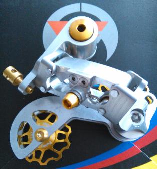 | Precision Billet Derailleurs made by Precision Billet / Proshift are one of the lightest rear derailleurs in the world. Because of the design these won't work with too large of a top gear as the pulley can hit the gear on the cassette. Please check the vintage instructions on this. Some units will have ceramic pulleys made by AEST. Complete weight = 153g. One of the lightest derailleurs in the world. All parts on this are Aluminum hardware or Titanium hardware. |