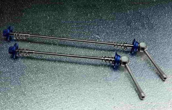 J&L Titanium bolt on Skewers Axles are made of 6/4 Titanium Alloy 2 stainless springs each Bolt On, Hex head Effective front hub width: 100mm, Effective rear hub width: 135mm suitable for Road & MTB 48.5 grams for the set |