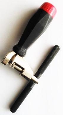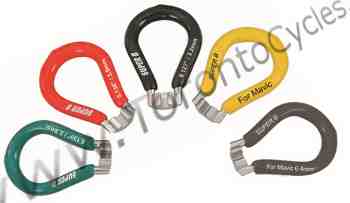 This spoke wrench is vinyl coated handle with chrome plated hardened steel ends. curved to set into the spoke for easy turning. |