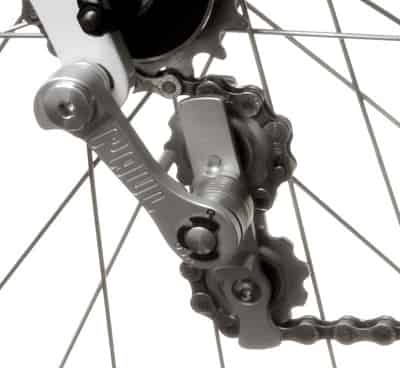 Vertical dropouts hold the rear axle at a fixed distance from the cranks and nine times out of ten this doesn’t put the rear wheel at the right spot for a single speed drivetrain. The result is a chain that is too loose or too tight. The Melvin takes care of the chain tension and lets you run a single speed wheel on almost any frame with a derailleur hanger. The Melvin uses two pulleys, just like a rear derailleur, which gives it 20 teeth of chain wrap. This means that the Melvin will work with multiple front chain rings while maintaining proper chain tension. Of course this is no longer a true single speed, but can come in handy when two or three gears are all you need. Twenty teeth of chain wrap means that chain rings with a maximum difference of twenty teeth can be used up front. The mounting pivot has spacers that can be arranged to adjust the chainline. The Melvin works best, of course, with our hubs, but the chainline spacers allow it to work with most other hubs too. In addition to the pivot spacers, the pulleys have side to side float to quiet slight variances in chainline. The pulleys are made of extruded and machined aluminum and have sealed bearings for durability. They are 2.25mm thick at the tooth which fits inside most narrow multi-speed chains, and the pulley cage is wide enough to allow 1/8″ single speed chains as well. 6061 Aluminum Weight 76g Chainline 19mm-27mm Largest Rear Cog 20 teeth Chain Wrap 20 Teeth↓ |