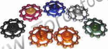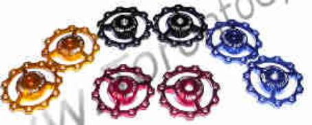 This is for a set of anodized jockey wheels. These have over sized sealed bearings. These pulleys work on all Shimano and all related vintage systems. 10 tooth, 14.5 grams for a set. |