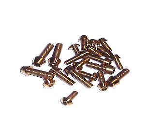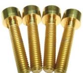 Gold Titanium Nitride Fasteners are produced by a process much the same as Black. This nitride coating is very durable and will not fade or chip. It is more expensive. Gold Nitride Titanium bolts are special order and if you have a suggestion please let me know and I might be able to arrange in the future. |