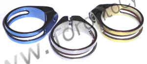 | This is for an aerozine aluminum ultra light seat post clamp. Available in several cool colours, and weighs an unbelievable 9 grams. A nice lightweight and secure addition to any Road or MTB. Titanium fastening bolt, CNC machined Clamp. These have a Lip Lock. |