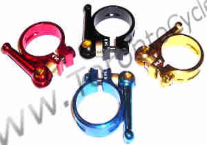 | This is for a cnc aluminum ultra light seat post clamp. Quick Release Version. Includes a titanium bolt, aluminum nut and hardware. For 31.8mm or 34.9mm seat tubes. These clamps have a lip lock. Please don't over torque. A little lubricant on the locking ball is suggested. |