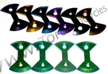 Several titanium colors are available that titanium anodizing can be applied. Titanium color is produced by light refraction and interference of wavelengths. The film thickness is very thin and can actually be polished out with a commercial Steel polish. The anodized layer is durable though, it takes heavy polish and rubbing to remove. Etching will also enhance color but dulls shine. It's impossible for me to exact match other colored titanium or anodized aluminum. Green Titanium Anodizing: Green titanium anodizing is a special process and an additional charge applies. The color is a high voltage (110-120v). Green titanium can be very difficult and some larger parts will not achieve the color. I have been asked about the process and sorry that I can't release many details. Black Titanium Anodizing: Black titanium is a special process and is not done in house. Vacuum Deposition is the process used to coat the bolts. Black titanium is very durable and will not fade or chip. Red Titanium Anodizing: There is no true red titanium. Pink vs. Purple Titanium Anodizing: There is some discrepancy on Pink and Purple Colors. Purple is quite dark and when wet can look brown, which is the color with the lower voltage. Purple can also be difficult to make because it's a narrow voltage band. A few volts less and it's brown. A few more and its blue. Dark Purple also smears and isn't the best color. Pink is a high voltage color and is also a different process. It's not true pink and some customers will say its purple. This is not the case. In the store pink is also lavender. Blue Titanium Anodizing: Blue is about the easiest color to make. I have a process that will make the color deeper though. Dark and light is the only real difference. Lighter blue is also called "electric blue". Gold Titanium Anodizing: Gold is higher voltages. At the peak the color can swing into a nasty pinkish on it's way to pink. Therefore gold can only be so dark before this happens. We avoid this thru careful voltage control. Gun Metal Grey Color: I can produce this color and is a special process. Also, a brownish titanium can be produced In Store Anodize (Titanium Color) I've been getting more requests to bring in ti to color. Recently knife owners have been coming in for this process. There will be a $10.00 charge for titanium anodize for non-purchased items. Green and Pink are $20.00 depending on the item(s). These 2 colors are much more difficult and I cannot guarantee on items other than what I have here. Some notes on this: 1. There is a $10.00 fee. 2. The titanium MUST be totally grease and oil free. 3. The ti cannot be mounted to steel or any other metal. 4. Larger titanium stock has to be brush plated, color can vary a bit on this process and isnt totally steady. Please contact me on this. 5. I'm not charging per item but cannot be a crazy amount of items either. Mailing in Titanium to Anodize: I am accepting titanium to anodize for the same rates as above. Shipping return costs are not included. Please contact Tom at Sales@torontocycles.com for more information and mailing instructions. How do I know it's Titanium? I have had a few customers that have brought me items to anodize and when I saw the item I told them it's not titanium. Of course they asked how do you know? I answered I just know which isn't really that helpful. Here's a few tips on how to tell if it's ti and not aluminum,stainless or other metals. 1. Titanium is tough. It will not scratch that easy and aluminum will. Most aluminum you can scuff with you fingernail if pressed hard. 2. Acid will not bother it as it's a non-reactive metal. 3. Titanium will not stick to a magnet. 4. Titanium can dull and become grey which can make you think its steel. Most titanium will polish well. 5. Titanium will anodize 6. Ti is half the weight of steel and a bit heavier than aluminum. 7. My own personal test is Smell. Ti will not smell like metal when rubbed. As I have found out by sorting bolts for hours there is no smell. All other base metals will smell. Work with steel tools for a while and you can smell the metal. rub coins or copper or even stainless and you can smell it on your fingers. 8. Titanium can be made into a variety of color. Hope this helps and if you have other tips please comment! |